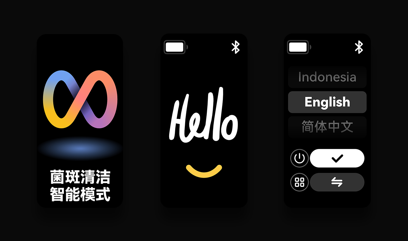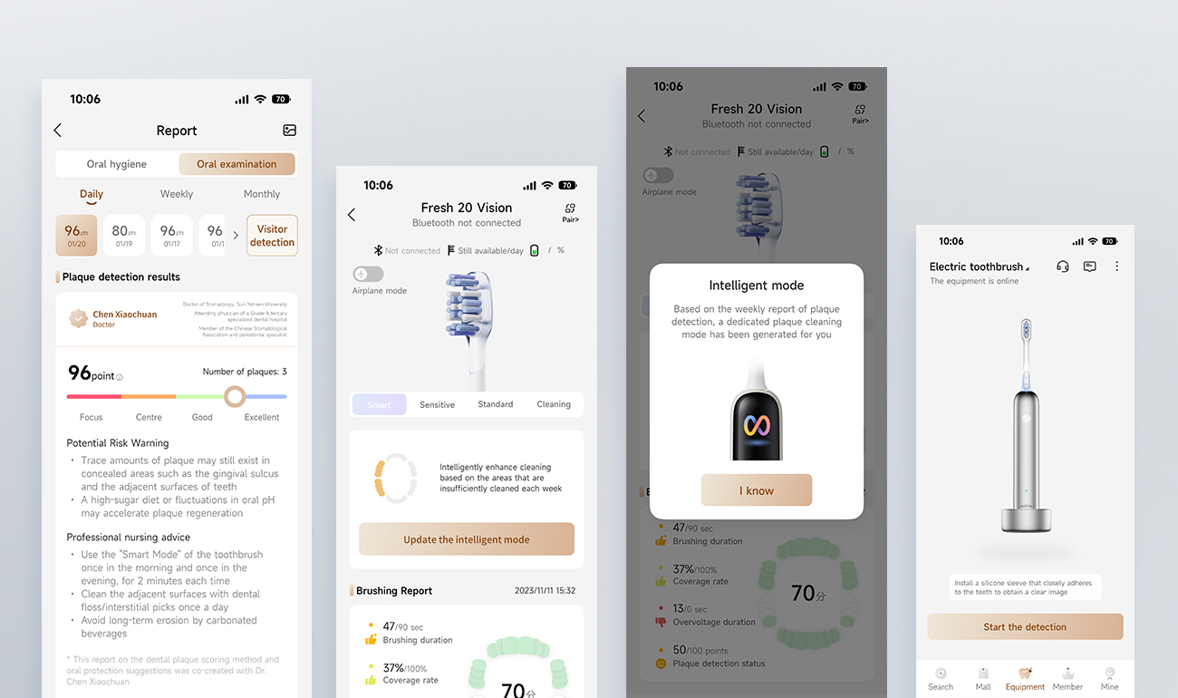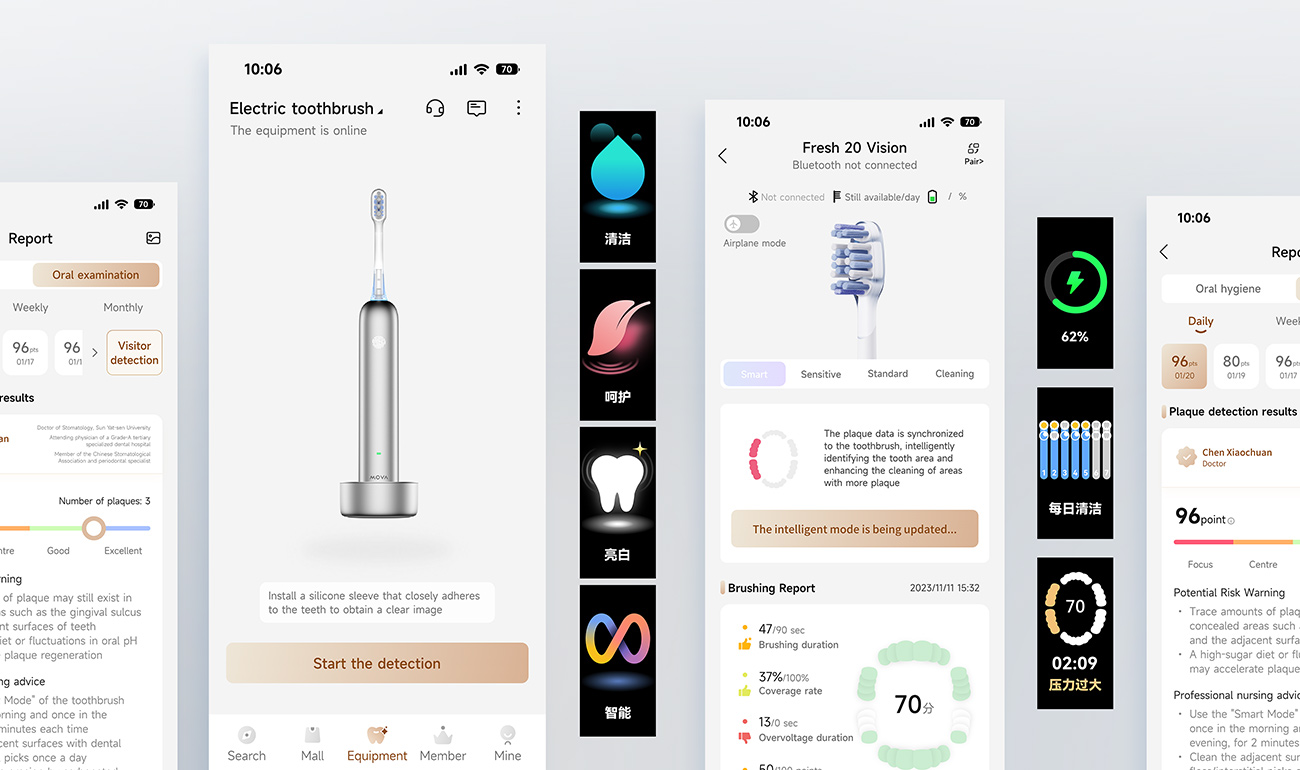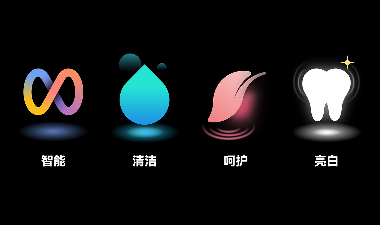 部分界面采用上下滑動的交互方式,采用同色系漸變塑造光影效果,底光向上打光照亮區(qū)域,即實(shí)用又美觀。按鈕采用相鄰色作為漸變主色,色度跨度小,不容易形成色差,適合在小屏幕上使用。同時(shí),適當(dāng)?shù)募哟蠼缑孀煮w,使用戶在使用牙刷時(shí)可以看的更加清晰。敏感模式放大信息區(qū),牙齒的元素作為背景點(diǎn)綴出現(xiàn)不會喧賓奪主。界面采用同風(fēng)格光線作分割線,合理分割不同信息板塊,采用柱狀圖來表達(dá)數(shù)據(jù)信息,柱狀圖采用相同漸變原理制作線性漸變,下方與背景色相互融合,讓色彩過渡更加自然和諧。整體以簡約大方為主,去除繁雜裝飾利于小屏展示,同時(shí)添加科技光線,賦予設(shè)計(jì)科技感。