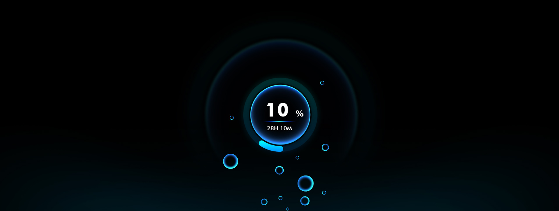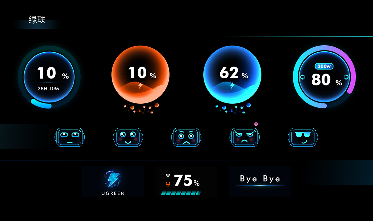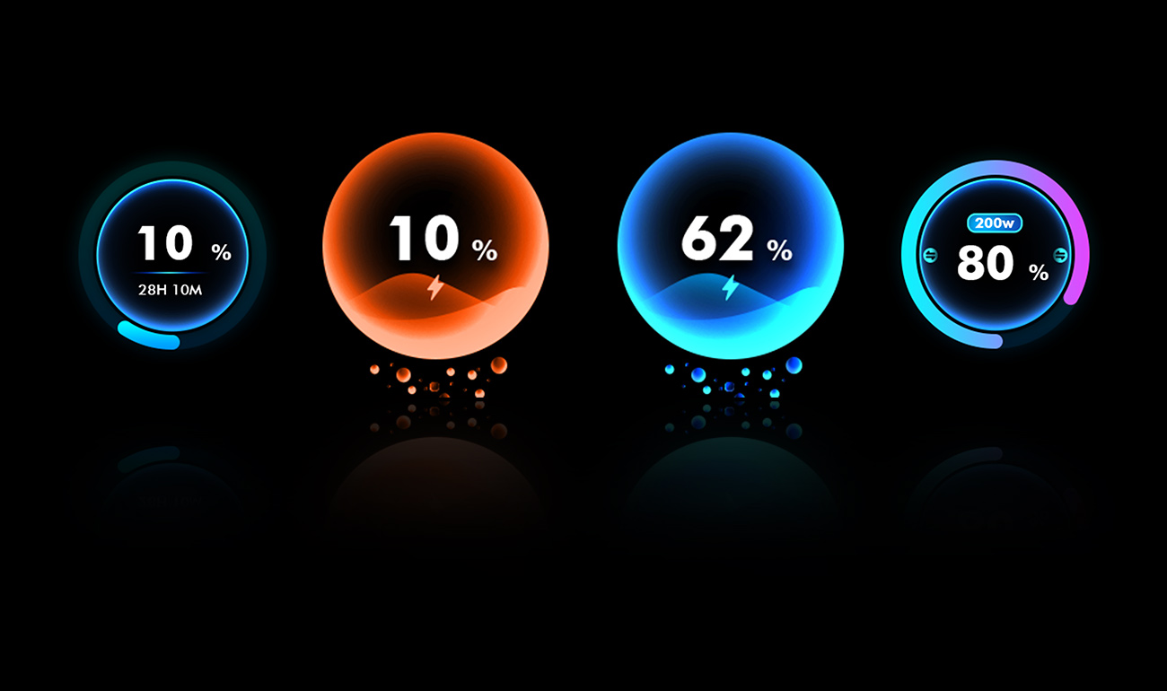 以藍色為基底,加入同色系亮藍偏青色制作漸變色,作為主色。充電界面小泡泡自下而上匯入能量球中,能量球中有水波紋隨著電量向上攀升表達電量狀況,同時,區(qū)分快充、慢充效果,快充時光影更加炫彩明亮,泡泡升起速度更快。炫彩的藍色進度條以無刻度模式展示,用不同色調(diào)塑造出氣泡通透感。標題采用微弱光影分割顯示區(qū),添加同色系漸變線條加強分割區(qū)。