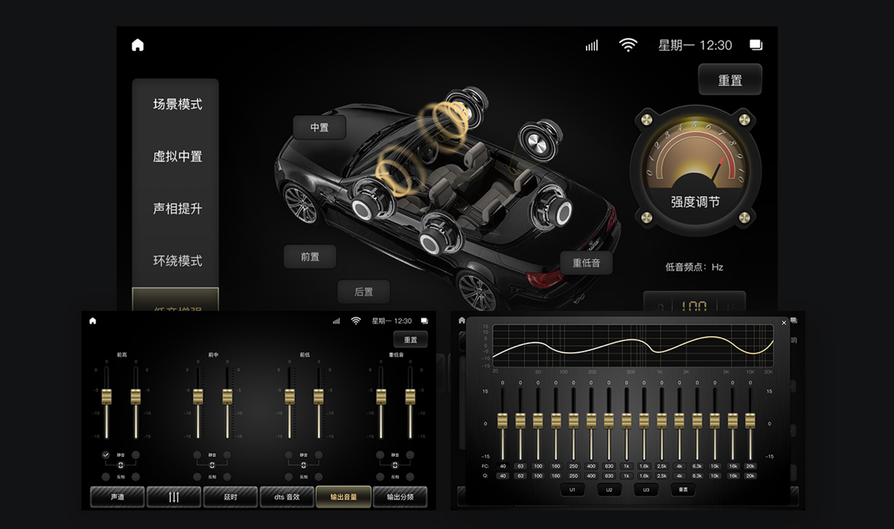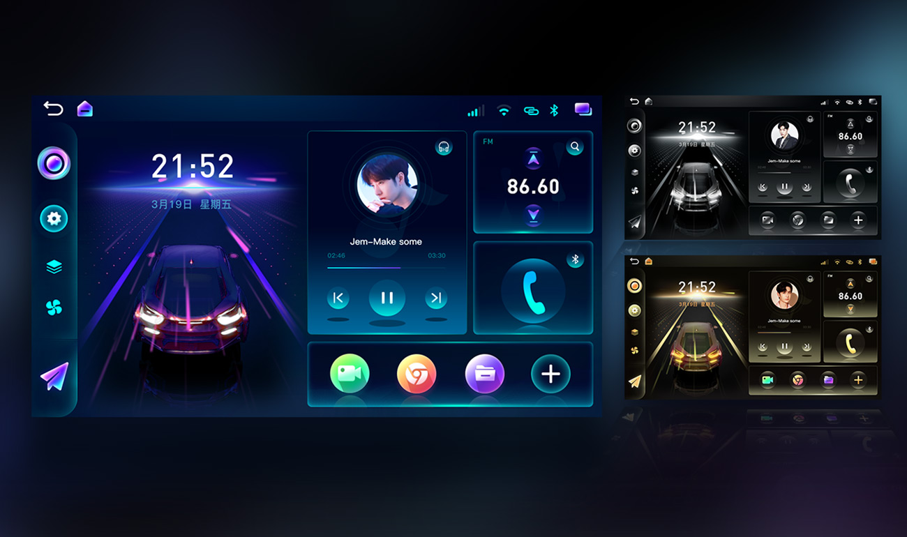 作為適應(yīng)大眾、包容性極強(qiáng)的車載系統(tǒng),UI搭配三色風(fēng)格選擇。用戶可以自主選擇絢麗多彩、迸發(fā)青春氣息的炫彩色,也可以選擇商務(wù)、簡潔的沉穩(wěn)黑,亦或是選擇奢侈、高貴的奢華金。界面結(jié)合用戶需求,加入動感元素,營造界面靈動感,流線化設(shè)計與汽車流暢形態(tài)相呼應(yīng),構(gòu)建車、車載系統(tǒng)兩者間的和諧關(guān)系。