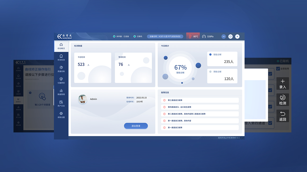 唯可可用研團隊和中核海得威團隊對目標人群的用戶調(diào)研訪談和競品分析,用藍色作為底色塑造現(xiàn)代科技感。 將UI界面與呼吸機緊密結(jié)合,比如,在界面內(nèi)添加圓形、球體,制作氣體動效;用界面的明暗關(guān)系制作立體效果,使畫面更加通透有質(zhì)感。